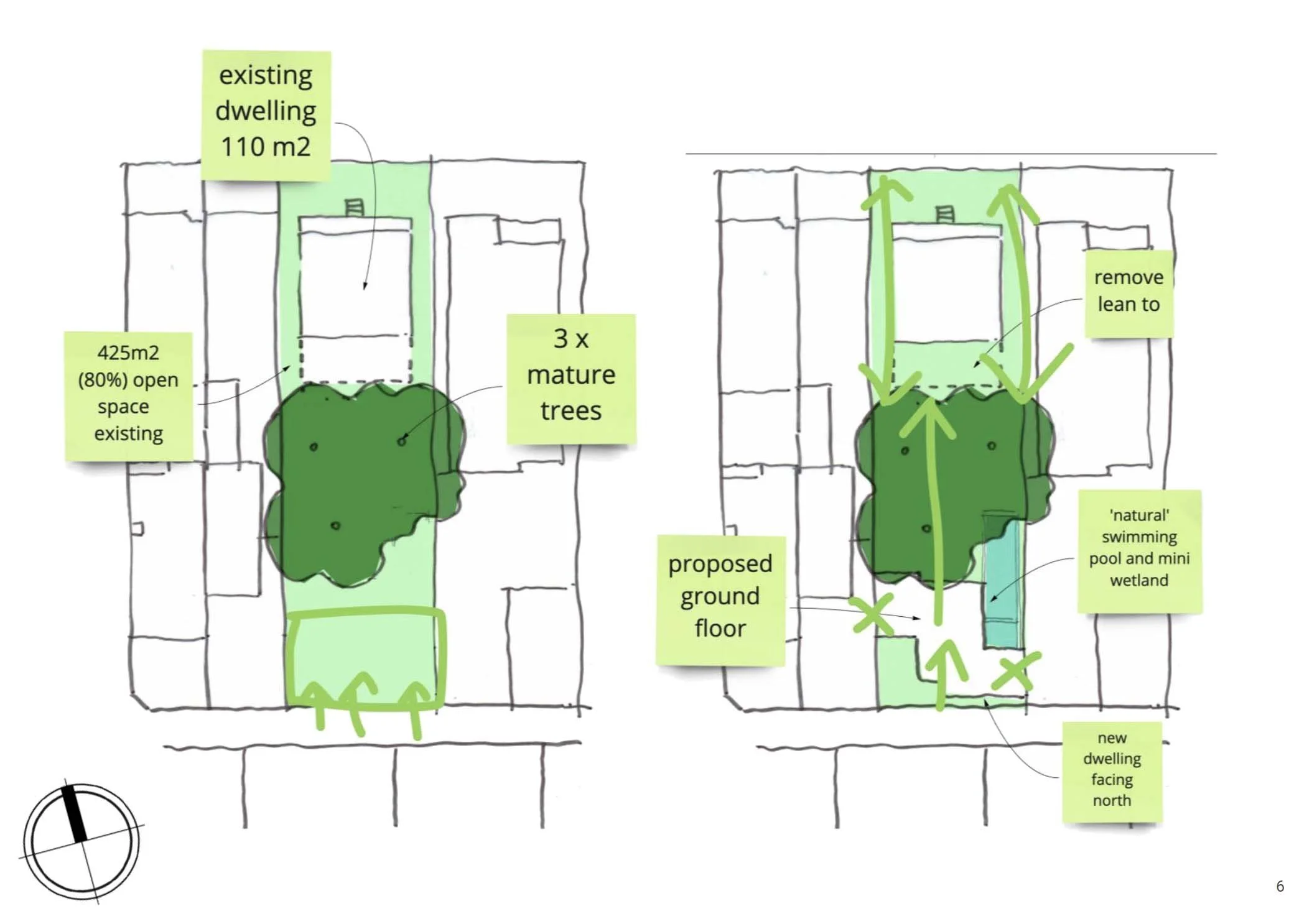 Site access is retained on both sides of the heritage cottage, and the laneway is upgraded through the provision of active frontage. This approach preserves the capacity for three dwellings to be accommodated on a single plot. Possible development arrangements are as follows: